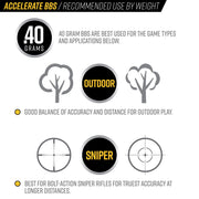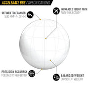 The Valken Accelerate ProMatch airsoft BBs are manufactured in Taiwan by one of the best known Airsoft BB manufacturers. These 6mm plastic airsoft BBs are precision grade quality, completely spherical, contain less than 5% air bubbles, and polished multiple times throughout the production process to ensure that the BB is seamless and has no surface imperfections. These 6mm precision BBs give you greater accuracy and consistency, and they are packaged in a unique rectangular bottle with a screw-on cap making storage, transport, and loading simple and convenient. Accelerate BB bottles do not roll around like other round bottles, which can spill easily.