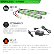The Valken NiMh 9.6v 1600mAh Split Type airsoft battery is made from high performance 1.2v cells. This NiMh battery has a slimmer design making it easier to fit into cramped battery compartments. The NiMh nunchuck battery is also easy to charge, and does not require discharging like NiCd battery packs. This NiMh butterfly battery has a long recharge life cycle, and consistent, reliable power output. They are built with 16AWG wiring and include a mini Tamiya connector.