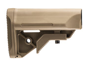 The Elite Force M4 Next Gen Stock offers airsoft players the ability to enhance their M4 AEG systems with a sleek, compact crane-style stock with easy-access battery storage in the rear via quick release drop-down hatch. The M4 Next Gen Stock allows for stick battery storage in not only the buffer tube of your rear-wired AEG, but also offers storage space in each of the two crane-style tubes within the stock.