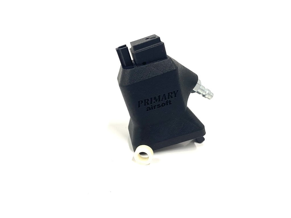 This is a custom designed laser sintered nylon adapter that allows you to use HPA (high pressure air) and X-9 AEG magazines with upgraded springs on your Hi-Capa airsoft pistol. To use it you will also need an X9 AEG magazine with an upgraded spring, “paintball” tank with low pressure regulator (0-140) psi, a hose with a Foster (polarstar) quick disconnect and of course bbs. The normal operating pressure for green gas is roughly 120 psi depending on the temperature. We recommend that you run you pistol near this pressure and do not exceed 140 psi. Keep in mind that higher pressures can cause excessive wear and damage to the internal components of your airsoft pistol.