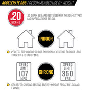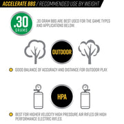 The Valken Accelerate ProMatch biodegradable airsoft BBs are manufactured in Taiwan by one of the best known Airsoft BB manufacturers. These 6mm airsoft BBs are precision grade quality, completely spherical, contain less than 5% air bubbles, and polished multiple times throughout the production process to ensure that the BB is seamless and has no surface imperfections. These 6mm precision BBs give you greater accuracy and consistency, and they are packaged in a unique rectangular bottle with a screw-on cap making storage, transport, and loading simple and convenient. Our BIO BBs are made from PLA (Polyactic Acid), which is recyclable and compostable thermoplastic derived from a renewable, earth friendly resource, such as corn starch. Accelerate BB bottles do not roll around like other round bottles, which can spill easily.