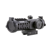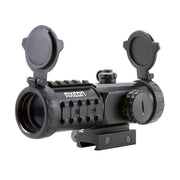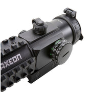 Fixed power prism optics are popular for many reasons, not the least of which is that they are robust, simple designs that just perform. Axeon Optics Prism 3X scope is a tough prism optic featuring an etched ballistic reticle that can be illuminated in your choice of five levels of red or green light. Of course, the major benefit of using an etched retilcle is that no illumination is needed to use it. The windage and elevation turrets are capped and tethered to the body and flip-up lens covers are included as well. Illumination is handled by a single CR2032 battery. Both sides and the top of the body are covered with Picatinny rail sections and the Prism 3X mounts to common Picatinny rail.