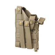 Innovative Ambidextrous Modular MOLLE Holster that is fully configurable for Full Size and Compact semi autos without or with tactical flashlights/lasers. With a Grid of Eyelets, this holster can be configured to fit various sizes and shapes of pistols. It can also be custom configured to fit around Tactical Flashlights/Lasers mounted onto the frame of the Pistol. With the use of the supplied tube spacers and bungee cords, the holster can be custom fitted to most Pistol without or with tactical flashlights and/or lasers. Included are three different types of retention features that can be used to keep the pistol secured to the holster: adjustable Thumb-Snap, Grip Retention Bungee Cord with pull tab, and 1" Nylon Grip Retention strap with quick connect buckles. With MOLLE webbing on both side this can be configured as a Left or Right handed holster. Feature also makes the Holster easy to attached to other MOLLE compatible gear. Includes two removable MOLLE straps with snap-button enclosure for attaching to MOLLE webbing. Includes 8 each optional rubber tube spacers, 2 each: bungee cords, cord locks, 1 each wooden stick tool for 1" Thumb Snap hook and loop height adjustments, 1" webbing w/snap button for holster muzzle stop