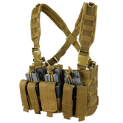 The Condor Recon Chest Rig is designed with built-in stacker/kangaroo style mag pouches to allow the user rapid, seamless access to mags for faster reloads with up to six AR/M4 mags and six pistol mags. The adjustable and removable flaps on the pistol pouches also allow the user to keep a knife, multi-tool, or other small accessories close at hand while training or on duty. This Condor Recon chest rig setup also features an interior mesh pocket for safely storing items close to the body. Swivi-Lockster quick-release buckles allow you to remove the chest rig quickly and easily when necessary. With grommets for drainage and padded cross-back shoulder straps, this Condor chest rig also helps you stay comfortable and dry.