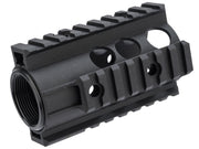 - Free float quad rail with Picatinny rail sections at the 12, 3, 6, and 9 o'clock positions