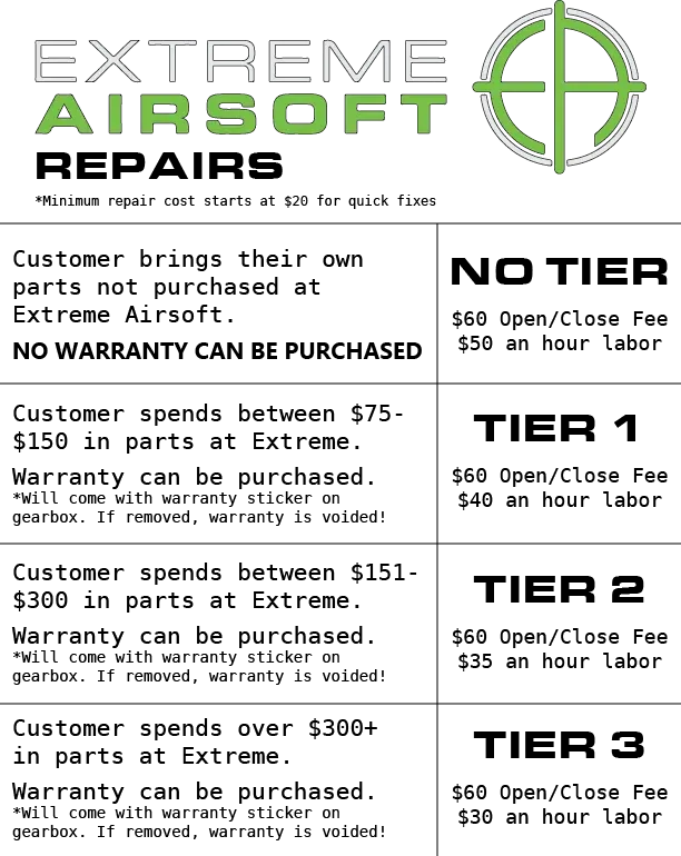 Once you have been notified that your repair has been completed via phone and email, you have 30 days to pick up your gun and pay for repair services rendered. Once 30 days has passed, all ownership of the gun is relinquished to Extreme Airsoft.